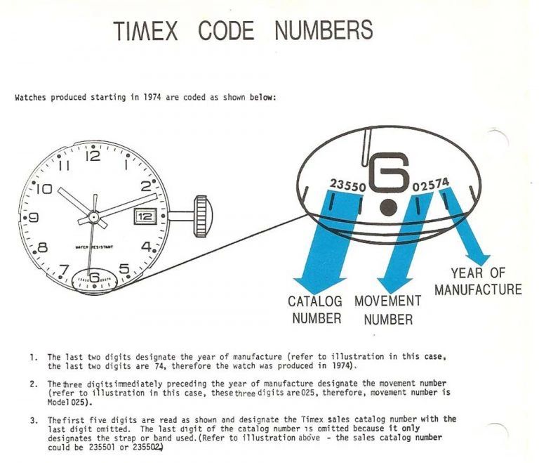 I decided with a little research I might be able to identify the model number and potentially the year it was made to confirm whether Bruce might have actually owned the watch. You see, for every watch created since 1963 Timex has imprinted the dial with a code number near the bottom of the face for ease in model identification. The code will also tell you the movement number and year of manufacture. All the pictures I could find were too blurry to confidently read the model number but I could barely read the watch movement number (025) and year of manufacture (last two digits) and it was looking like 7 "something".
